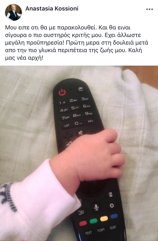 Μάλιστα, προανήγγειλε την επιστροφή της με μια τρυφερή φωτογραφία στο Facebook, που απεικονίζει το χεράκι του γιου της να κρατά ένα τηλεκοντρόλ και το γλυκό μήνυμα: «Μου είπε ότι θα με παρακολουθεί. Και θα είναι σίγουρα ο πιο αυστηρός κριτής μου. Έχει άλλωστε μεγάλη προϋπηρεσία! Πρώτη μέρα στη δουλειά μετά από την πιο γλυκιά περιπέτεια της ζωής μου. Καλή νέα μας αρχή!».