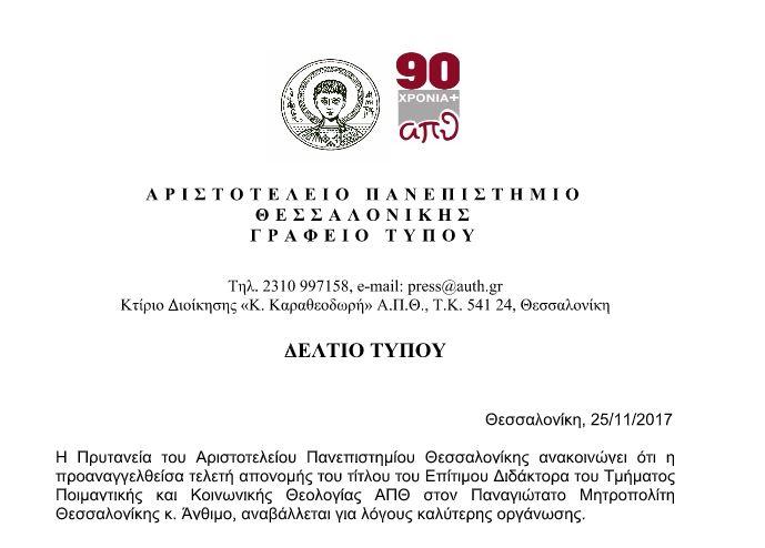 Με μία ολιγόλογη ανακοίνωση, το ΑΠΘ ανακοίνωσε ότι η τελετή απονομής του τίτλου του Επίτιμου Διδάκτορα του Τμήματος Ποιμαντικής και Κοινωνικής Θεολογίας ΑΠΘ, στο Μητροπολίτη Θεσσαλονίκης Άνθιμο, αναβάλλεται για λόγους καλύτερης οργάνωσης.