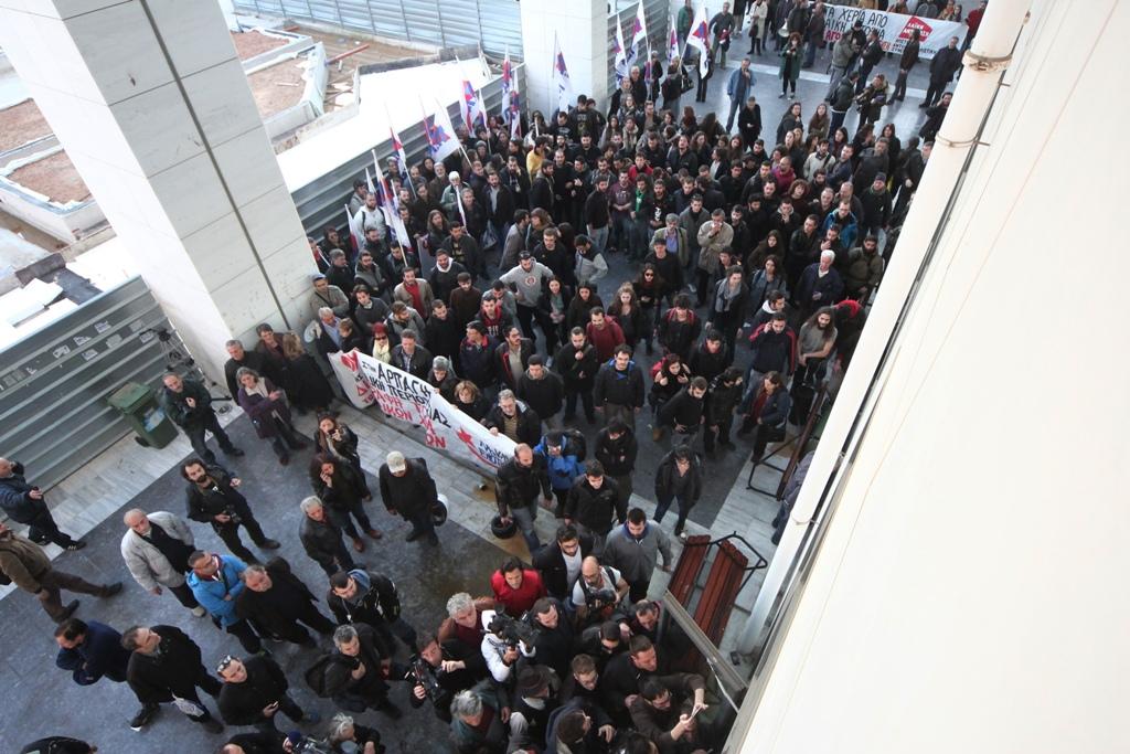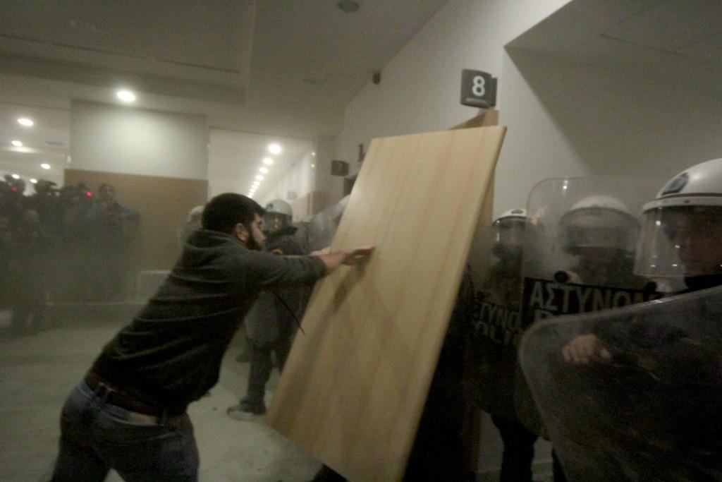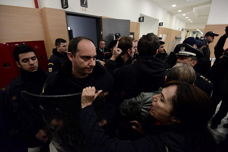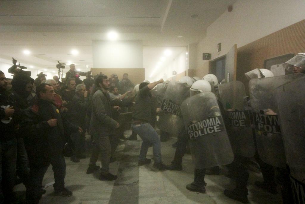 «Θα μπούμε μέσα! Στις 4 ξεκινάει η διαδικασία! Θα μπούμε μέσα!», φώναξαν μέλη των «Δεν Πληρώνω». Τα ΜΑΤ είχαν αποκλείσει την αίθουσα του δικαστηρίου και δεν επέτρεπαν στους διαδηλωτές να μπουν για να προσεγγίσουν τους συμβολαιογράφους.
