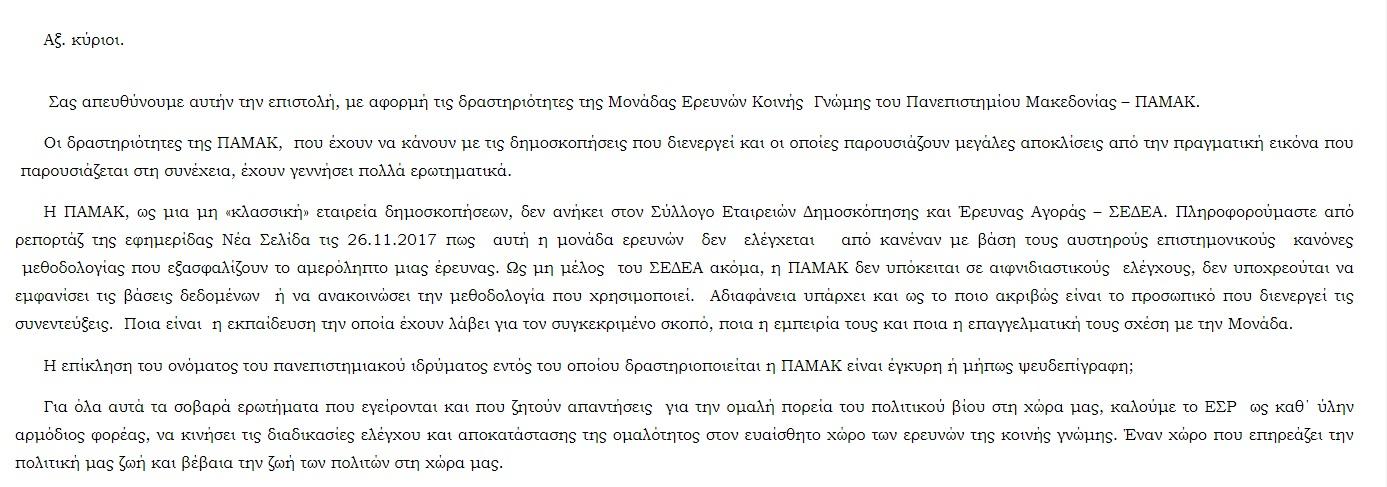 Επιστολή προς το ΕΣΡ, για τις δραστηριότητες της Μονάδας Ερευνών Κοινής Γνώμης του Πανεπιστημίου Μακεδονίας – ΠΑΜΑΚ, απέστειλαν οι βουλευτές Πάνος Σκουρολιάκος (ΣΥΡΙΖΑ ), Αθανάσιος Παπαχριστόπουλος (ΑΝΕΛ) και Ιωάννης Σαρίδης (Ένωση Κεντρώων).
