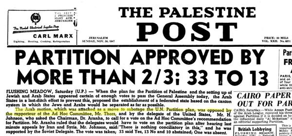 Στις 29 Νοεμβρίου 1947 η γενική Συνέλευση του ΟΗΕ στη Νέα Υόρκη ψηφίζει υπέρ της διάσπασης της Παλαιστίνης. Η απόφαση 181 υιοθετήθηκε με 33 ψήφους υπέρ (μεταξύ αυτών οι ΗΠΑ, η Σοβιετική Ένωση και η Γαλλία), 13 ψήφους κατά (μεταξύ αυτών και τα αραβικά κράτη) και 10 αποχές (εκ των οποίων και η Βρετανία).