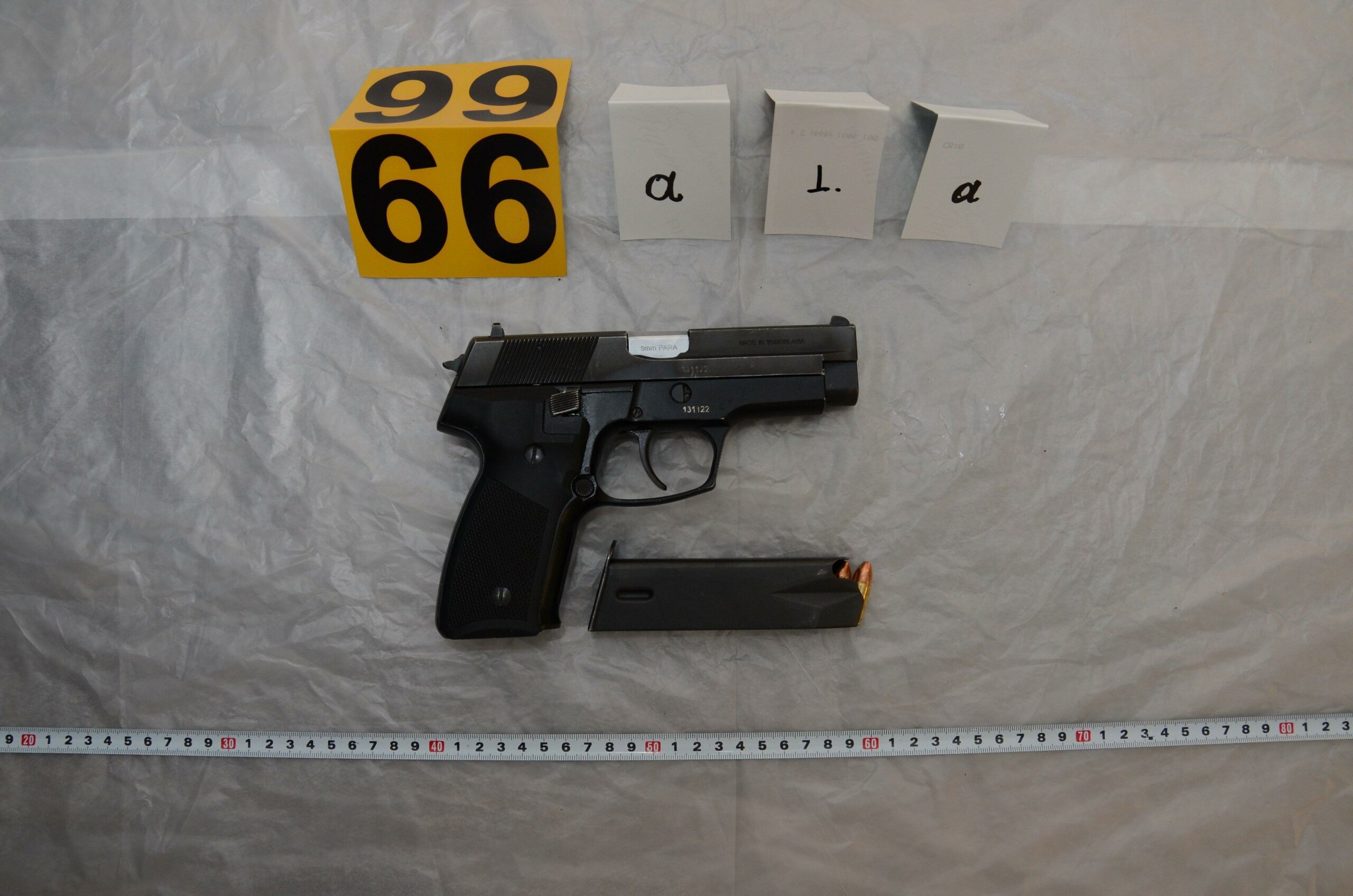 Μεταξύ των αντικειμένων που έχουν κατασχεθεί μέχρι στιγμής στο πλαίσιο των αστυνομικών ερευνών, περιλαμβάνεται και πιστόλι CZ .