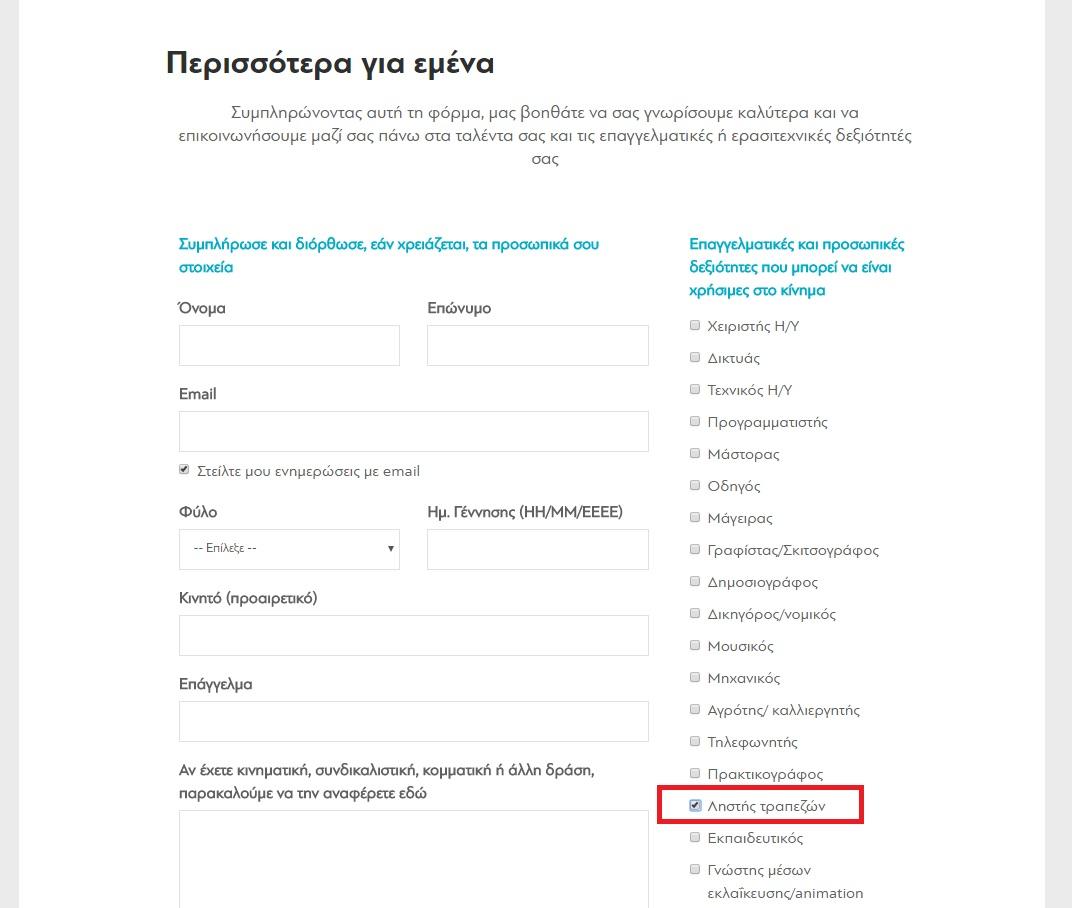 Ο ενδιαφερόμενος «υποστηρικτής» μπορεί να δηλώσει τα προσωπικά του στοιχεία, αλλά και τις «επαγγελματικές και προσωπικές δεξιότητες που μπορεί να είναι χρήσιμες στο κίνημα», επιλέγοντας μεταξύ συγκεκριμένων επιλογών.