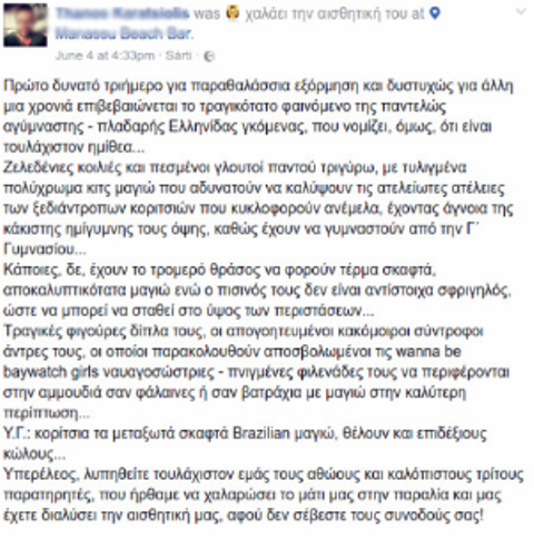 «Σήμερα μέσω του πληρεξούσιου δικηγόρου μου και καλού φίλου και συνεργάτη μου εξ Αθηνών, Ιωάννη Καλαΐτζίδη, αγωγή εναντίον Σοφίας Σκορδά και του τηλεοπτικού σταθμού ΑΝΤ1 για τα όσα προσβλητικά και υβριστικά κατ’ εμέ ειπώθηκαν προ εξαμήνου περίπου στην πρωινή εκπομπή της κυρίας Σοφίας Σκορδά με τίτλο «Το πρωινό» την 13η Ιουνίου 2017.