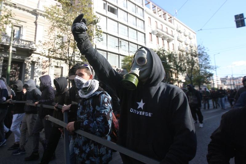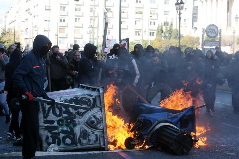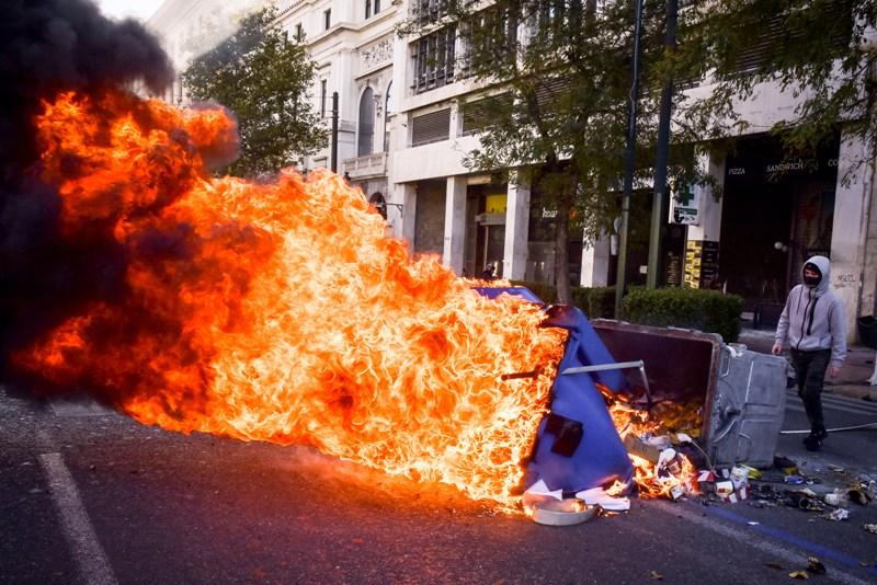 Κατά την πορεία ομάδες νεαρών με καδρόνια έσπασαν βιτρίνες και φανάρια, ενώ έβαλαν φωτιά σε κάδους.