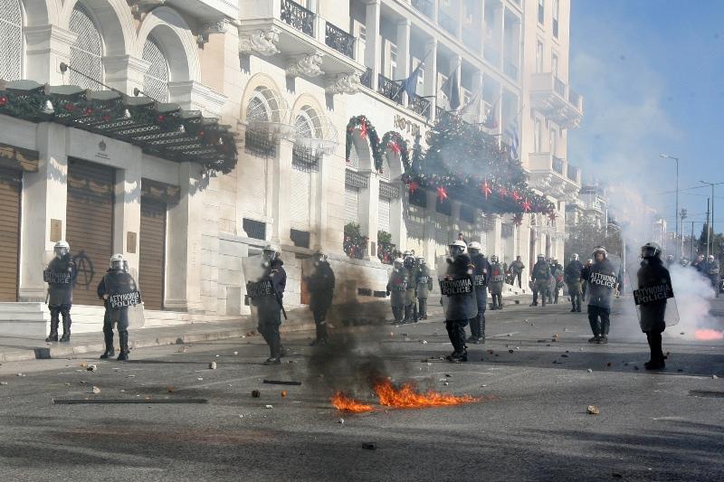 Φτάνοντας η κεφαλή της πορείας στην πλατεία Συντάγματος, τα επεισόδια μεταξύ νεαρών και αστυνομικών συνεχίστηκαν.