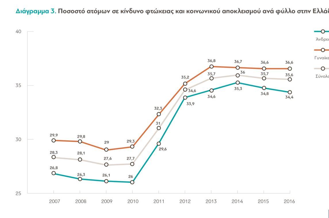 Το Διάγραμμα 3 απεικονίζει το ποσοστό ατόμων σε κίνδυνο φτώχειας ή κοινωνικού αποκλεισμού κατά την περίοδο 2007-2016. Η αύξηση του ποσοστού είναι της τάξης των 8 ποσοστιαίων μονάδων, η οποία πρακτικά σημαίνει αυξημένο κίνδυνο φτωχοποίησης ή αποκλεισμού ενός πολύ σημαντικού πληθυσμιακού ποσοστού (περίπου 700.000 ατόμων), το οποίο στην περίοδο πριν την κρίση λογιζόταν ως μεσαία τάξη. Μάλιστα, όπως φαίνεται στο ίδιο διάγραμμα, η αύξηση αυτή είναι εφάμιλλη για άνδρες και γυναίκες.