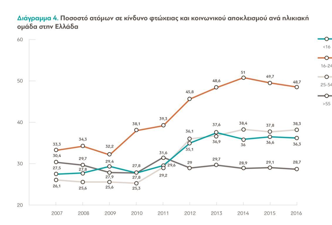 Όπως φαίνεται στο Διάγραμμα 4 η μόνη ηλικιακή ομάδα για την οποία δεν παρατηρείται αύξηση είναι αυτή των 55 ετών και άνω, που κυρίως περιλαμβάνει συνταξιούχους. Αντίθετα, αυξάνεται τόσο ο κίνδυνος παιδικής φτώχειας και κοινωνικού αποκλεισμού, όσο και ο αντίστοιχος κίνδυνος για τις παραγωγικές ηλικίες. Ιδιαίτερη μνεία οφείλουμε στην τεράστια αύξηση του κινδύνου για τους νέους 16-24 ετών.