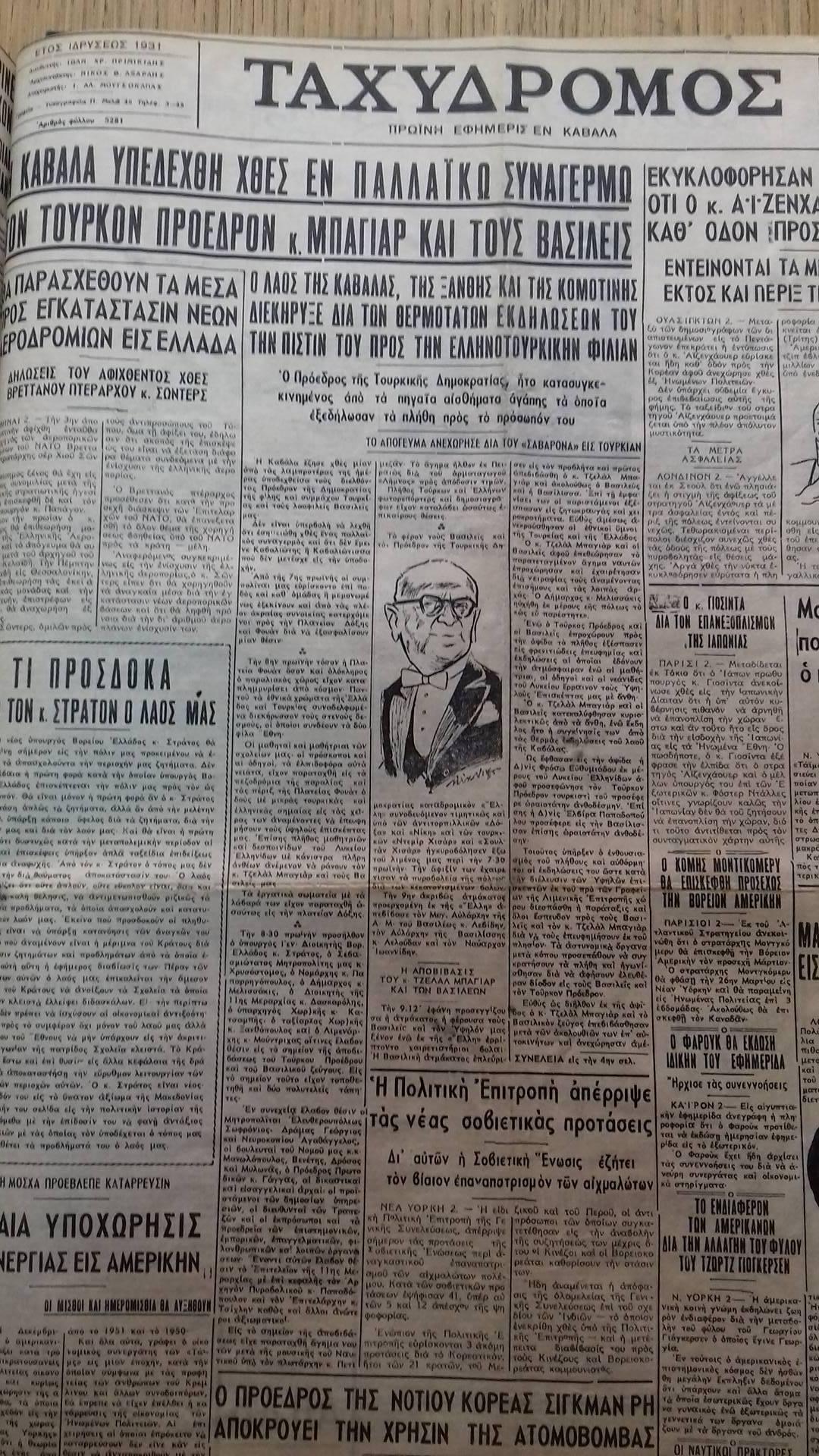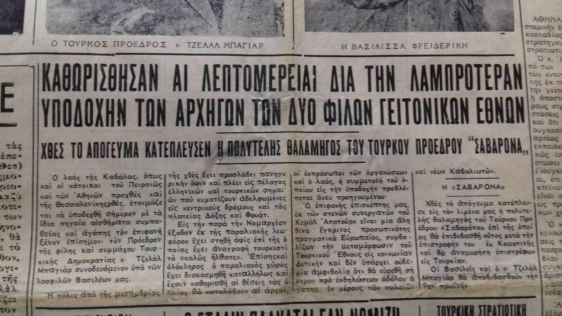 Κι αυτό δεν είναι μια συγγραφική υπερβολή. Αν ανατρέξει κάποιος στα αρχεία της εποχής θα διαπιστώσει με έκπληξη το μέγεθος της λαμπρής υποδοχής που έτυχε ο Τούρκος Πρόεδρος επισκεπτόμενος την Ελλάδα και την μεγάλη παρουσία του κόσμου που έσπευσε να δει από κοντά τον Τζελάλ Μπαγιάρ στην επίσκεψη που είχε πραγματοποιήσει στην Καβάλα, την Ξάνθη και την Κομοτηνή συνοδευόμενος από τους βασιλείς, Παύλο και Φρειδερίκη.