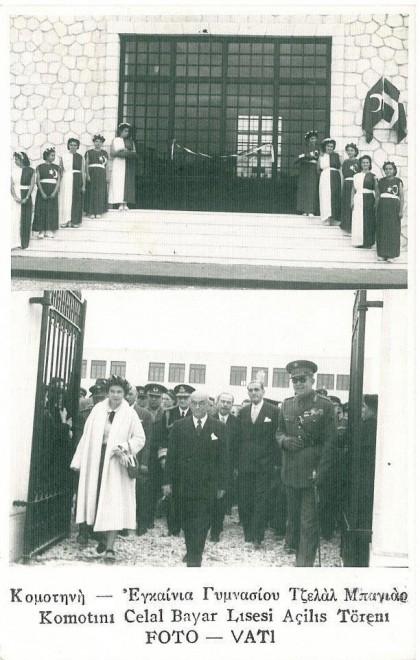 Αμέσως μετά, οι επίσημοί αναχώρησαν οδικώς για την Κομοτηνή, όπου είχε έρθει πλέον η στιγμή των εγκαινίων. Στην αυλή του σχολείου Ο υπουργός Εθνικής Παιδείας και ο πρόεδρος του Εράνου, του Παύλου και της Φρειδερίκης, έβγαλαν από έναν λόγο στα γαλλικά, τονίζοντας τη σημασία που έχει το σχολείο στη ΕλληνοΤουρκική φιλία. Στη συνέχεια ο βασιλιάς έδωσε το ψαλίδι στον Τούρκο Πρόεδρο, ο οποίος και έκοψε τη κορδέλα, ενώ στη συνέχεια όλοι μαζί ξεναγήθηκαν στο κτήριο του σχολείου.