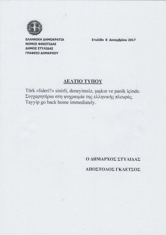 Με μια… τρίγλωσση ανακοίνωση επέλεξε ο δήμαρχος Στυλίδας Απόστολος Γκλέτσος να εκφράσει την οργή του για την επίσκεψη του Τούρκου προέδρου Ρετζέπ Ταγίπ Ερντογάν στην Ελλάδα και τα όσα είπε κατά τις επίσημες συναντήσεις του.