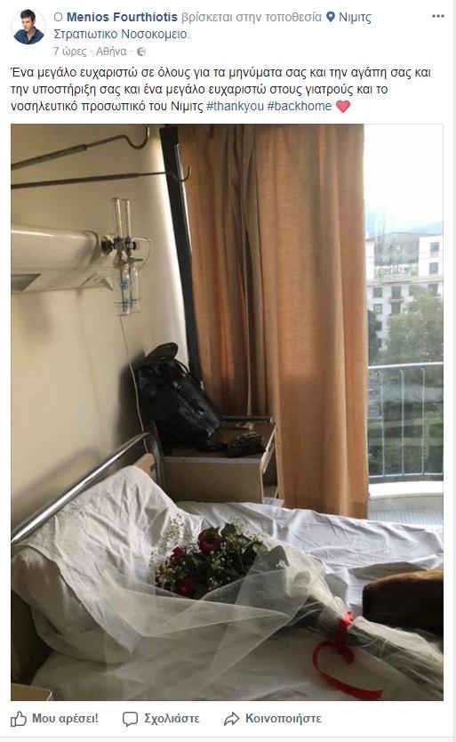 Εξιτήριο πήρε ο Μένιος Φουρθιώτης, ο οποίος πριν από λίγες μέρες είχε μεταφερθεί εσπευσμένα στο νοσοκομείο, εξαιτίας ενός προβλήματος που είχε με το στομάχι του. Ο παρουσιαστής θέλησε να ευχαριστήσει δημόσια τους γιατρούς και το νοσηλευτικό προσωπικό του νοσοκομείου, καθώς και τους διαδικτυακούς του φίλους για τις ευχές τους.
