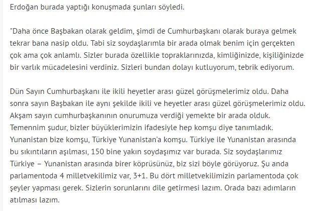 Επίσης, το δημοσίευμα αναφέρει ότι κατά την έναρξη της ομιλίας του ο Ερντογάν έκανε λόγο για συμπατριώτες του και όχι για τους Έλληνες Μουσουλμάνους: «Για μένα έχει πραγματικό νόημα να βρίσκομαι εδώ μαζί με τους ομοεθνείς μου».