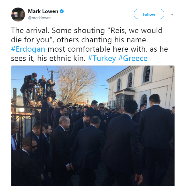 Ο Tούρκος πρόεδρος περπάτησε από το τζαμί ως το σχολείο, και στη διάρκεια της διαδρομής μέλη της μουσουλμανικής κοινότητας είχαν συγκεντρωθεί στις δυο πλευρές του δρόμου, προκειμένου να τον δουν από κοντά και να τον χειροκροτήσουν.