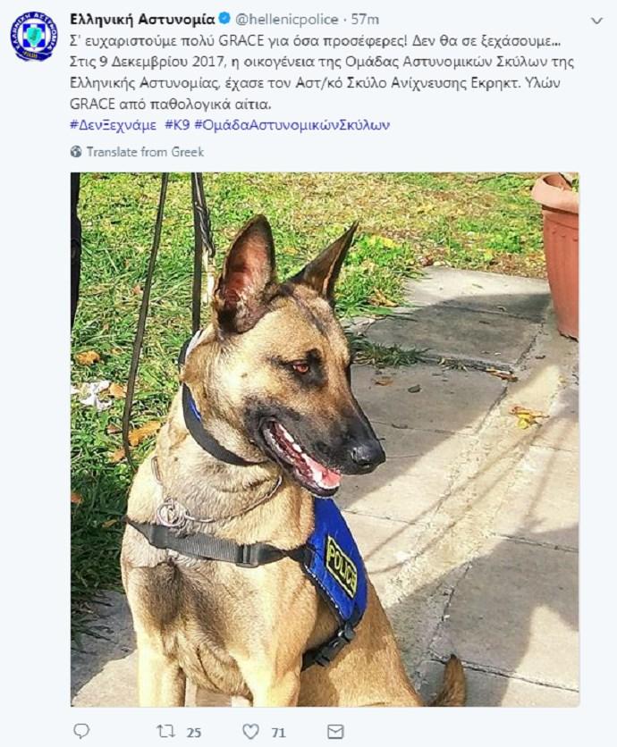 «Σ’ ευχαριστούμε πολύ GRACE για όσα προσέφερες! Δεν θα σε ξεχάσουμε… Στις 9 Δεκεμβρίου 2017, η οικογένεια της Ομάδας Αστυνομικών Σκύλων της Ελληνικής Αστυνομίας, έχασε τον Αστ/κό Σκύλο Ανίχνευσης Εκρηκτικών Υλών GRACE από παθολογικά αίτια», γράφει στο μήνυμα της η ΕΛΑΣ.
