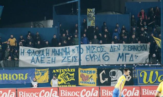 «Η φλόγα, η μνήμη και το μίσος δεν σβήνουν… Αλέξη ζεις, Θύρα 6», έγραφε το πανό των οπαδών του συλλόγου του Αγρινίου στις εξέδρες του γηπέδου τους στο χθεσινό παιχνίδι.