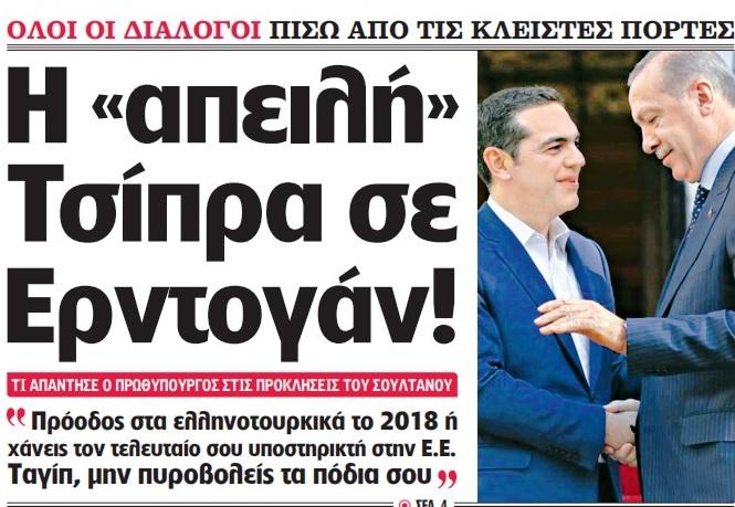 Με τίτλο “Η «απειλή» Τσίπρα σε Ερντογάν!” κυκλοφόρησε σήμερα Κυριακή η Realnews, με την εφημερίδα να αποκαλύπτει όλους τους διαλόγους πίσω από τις κλειστές πόρτες και τι απάντησε ο πρωθυπουργός στις προκλήσεις του Σουλτάνου.