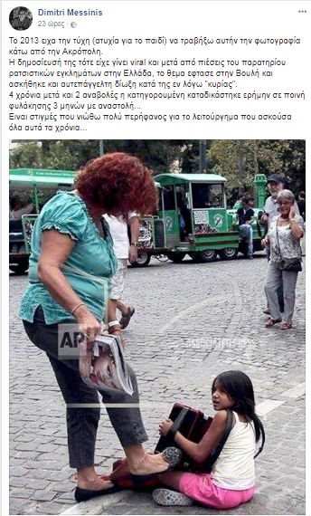 «Το 2013 είχα την τύχη (ατυχία για το παιδί) να τραβήξω αυτήν την φωτογραφία κάτω από την Ακρόπολη. Η δημοσίευσή της τότε είχε γίνει viral και μετά από πιέσεις του παρατηρίου ρατσιστικών εγκλημάτων στην Ελλάδα, το θέμα έφτασε στην Βουλή και ασκήθηκε και αυτεπάγγελτη δίωξη κατά της εν λόγω “κυρίας”. 4 χρόνια μετά και 2 αναβολές η κατηγορουμένη καταδικάστηκε ερήμην σε ποινή φυλάκισης 3 μηνών με αναστολή… Είναι στιγμές που νιώθω πολύ περήφανος για το λειτούργημα που ασκούσα όλα αυτά τα χρόνια».