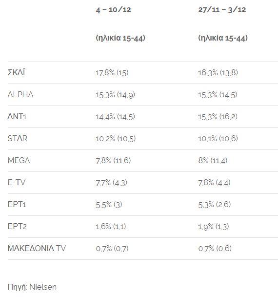 Παραμένει στην κορυφή, με αρκετή πλέον διαφορά από τον δεύτερο πάντα Alpha και από τον ανταγωνιστικό στην ψυχαγωγία ΑΝΤ1, ο οποίος την περασμένη εβδομάδα σημείωσε οριακή πτώση.