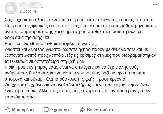 Το πρωί της Κυριακής, με μια ανάρτησή της στο Facebook, η 45χρονη ευχαρίστησε όσους της στάθηκαν τα τελευταία 24ωρα μετά τα όσα συνέβησαν και τους ευχήθηκε να επιλέγουν και να έχουν δίπλα τους αληθινούς ανθρώπους.