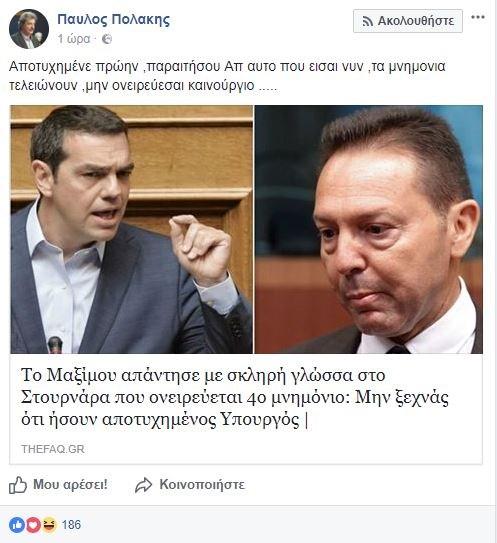 «Αποτυχημένε πρώην, παραιτήσου απ’ αυτό που είσαι νυν, τα μνημόνια τελειώνουν, μην ονειρεύεσαι καινούργιο…», αναφέρει χαρακτηριστικά στην ανάρτησή του ο κ. Πολάκης.