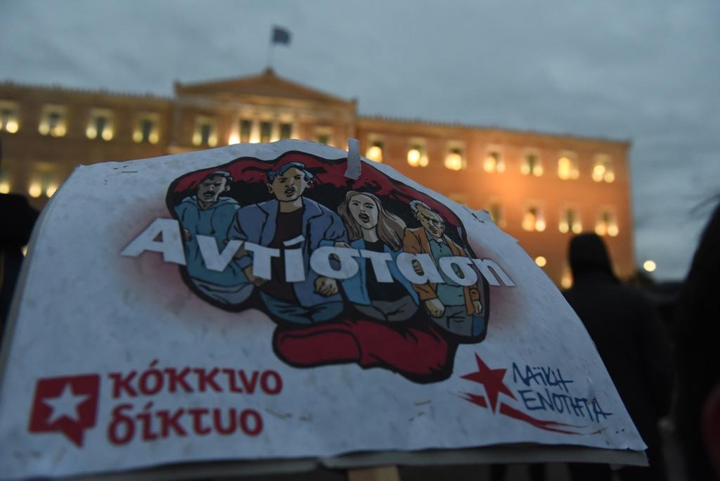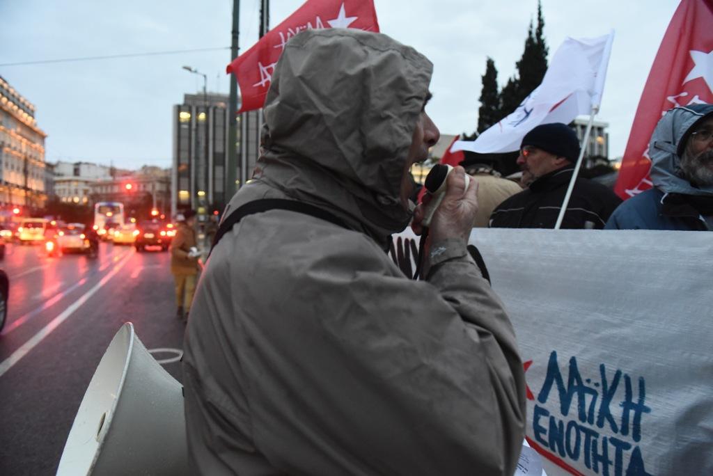 Στην κεφαλή της πορείας βρίσκεται αντιπροσωπεία του ΚΚΕ, ανάμεσά τους κι ο γενικός γραμματέας του κόμματος, Δημήτρης Κουτσούμπας.