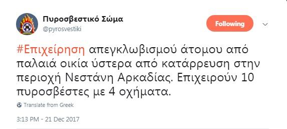 Σώος απεγκλωβίστηκε από τους πυροσβέστες ένας άνδρας, μετά από μερική κατάρρευση παλαιού σπιτιού στην περιοχή Νεστάνη της Αρκαδίας.