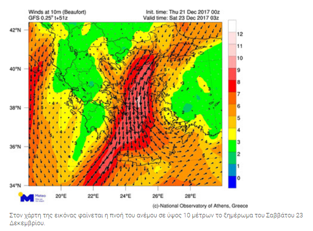 Άνεμοι: βορειοανατολικοί 5 με 6, βαθμιαία από τα δυτικά βόρειοι 7 με Θ και τη νύχτα 9 και πιθανόν στις Κυκλάδες 10 μποφόρ.