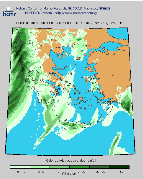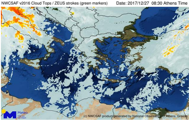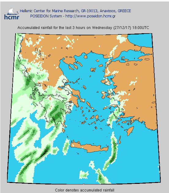– Την Πέμπτη (28/12/2017) το Ιόνιο, η Ήπειρος, η δυτική Στερεά και βαθμιαία από το μεσημέρι η Πελοπόννησος, η ανατολική Μακεδονία, η Θράκη και πιθανόν πρόσκαιρα τα υπόλοιπα ηπειρωτικά. Το βράδυ η Κρήτη και τη νύχτα οι Κυκλάδες και τα νησιά του βόρειου και ανατολικού Αιγαίου.