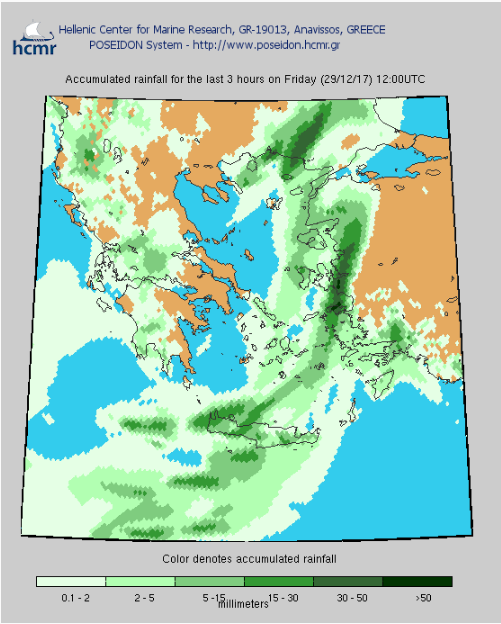 – Την Παρασκευή (29/12/2017) μέχρι το πρωί η ανατολική Μακεδονία, μέχρι το βράδυ η Κρήτη, οι Κυκλάδες, η Θράκη, τα νησιά του βορείου και ανατολικού Αιγαίου και τα Δωδεκάνησα. Κατά διαστήματα πιθανόν το βόρειο Ιόνιο, η Ήπειρος, η δυτική Στερεά και η δυτική και νότια Πελοπόννησος.