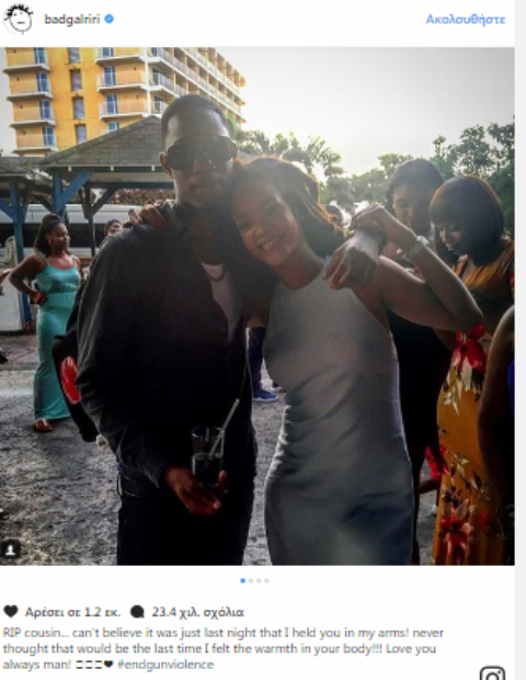 «Ξάδερφε δεν μπορώ να πιστέψω πως το προηγούμενο βράδυ σε κρατούσα αγκαλιά. Ποτέ δεν μπορούσα να πιστέψω πως αυτή ήταν η τελευταία φορά που ένιωθα τη ζεστασιά του κορμιού σου. Θα σ’ αγαπώ για πάντα» έγραψε η Rihanna συνοδεύοντας την ανάρτησή της με μία κοινή τους φωτογραφία.