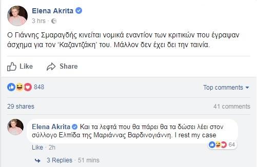 Η Έλενα Ακρίτα, παρεμβαίνοντας στο θόρυβο που έχει δημιουργηθεί έγραψε με καυστικό τρόπο στο Facebook: «Ο Γιάννης Σμαραγδής κινείται νομικά εναντίον των κριτικών που έγραψαν άσχημα για τον “Καζαντζάκη” του. Μάλλον δεν έχει δει την ταινία».