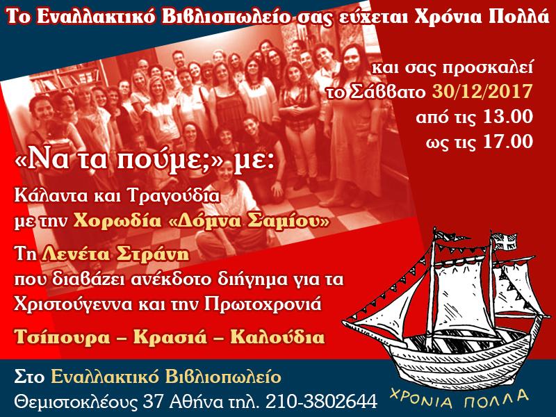 «Χρόνια πολλά» σε όλους εύχεται το «Εναλλακτικό Βιβλιοπωλείο» και σας προσκαλεί σε εορταστικές εκδηλώσεις στο κατάστημά του, στην Θεμιστοκλέους, το Σάββατο 30 Ιανουαρίου, από τις 13.00 το μεσημέρι μέχρι τις 17.00 το απόγευμα.