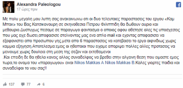 Χωρίς δουλειά στη μέση της σεζόν αναγκάστηκε να μείνει η Αλεξάνδρα Παλαιολόγου όπως και οι συντελεστές της παράστασης «Καμ Μπακ», γεγονός που η ίδια καταγγέλει μέσω μια ανάρτησής της στον προσωπικό της λογαριασμό στο facebook.
