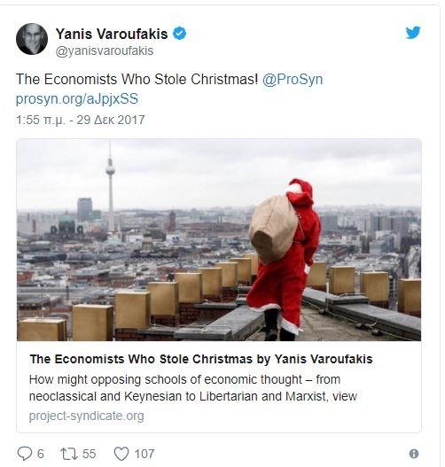 Με χιούμορ αποφάσισε να πει «αντίο» στο 2017 ο πρώην υπουργός Οικονομικών, Γιάνης Βαρουφάκης, γράφοντας στο prosyn.org ένα αφιέρωμα στη σχέση των Χριστουγέννων με τις διάφορες οικονομικές σχολές.