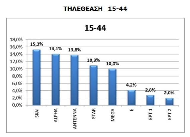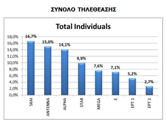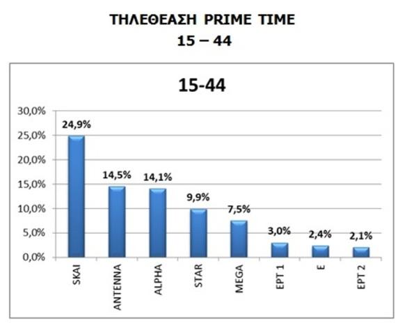 Σύμφωνα με τα στοιχεία της Nielsen, ο ΣΚΑΪ ήταν πρώτος τόσο στο σύνολο του κοινού, όσο και στις ηλικίες 15-44. Εντυπωσιακή ήταν και η πρωτιά στο prime time, τόσο στο σύνολο του κοινού, όσο και στις ηλικίες 15-44.
