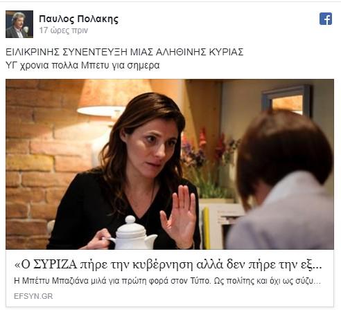 Με αφορμή κάποια αρνητικά σχόλια για τη συνέντευξη της Μπέτυς Μπαζιάνα, ο Παύλος Πολάκης δημοσίευσε στον προσωπικό του λογαριασμό στο facebook τη δική του άποψη για την πολύκροτη συνέντευξη που δόθηκε από τη σύζυγο του Πρωθυπουργού στην Εφημερίδα των Συντακτών.
