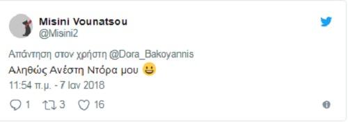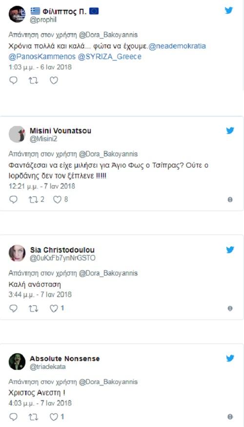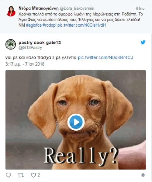 Η ανάρτηση της Ντόρας Μπακογιάννη στο twitter για τα Θεοφάνεια, άναψε φωτιές και έριξε το σύστημα, αφού το ιστορικό στέλεχος της ΝΔ, μπέρδεψε τις ευχές των Θεοφανείων με εκείνες της Ανάστασης και έγραψε: «Το Άγιο Φως να φωτίσει όλους τους Έλληνες»
