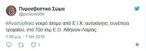 Σύμφωνα με την Πυροσβεστική το τροχαίο σημειώθηκε στο 70ο xλμ της Εθνικής Οδού και χρειάστηκε η επέμβασή της για τον απεγκλωβισμό νεκρού ατόμου από επιβατικό όχημα.