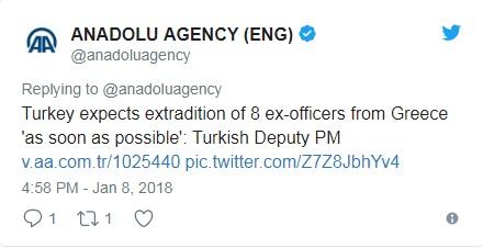 Την έκδοση των οκτώ στρατιωτικών που έχουν καταφύγει στην Ελλάδα περιμένει η Τουρκία «το συντομότερο δυνατόν», όπως επισήμανε ο αντιπρόεδρος της τουρκικής κυβέρνησης Μπεκίρ Μποζντάγκ, σύμφωνα με το πρακτορείο ειδήσεων Anadolu.