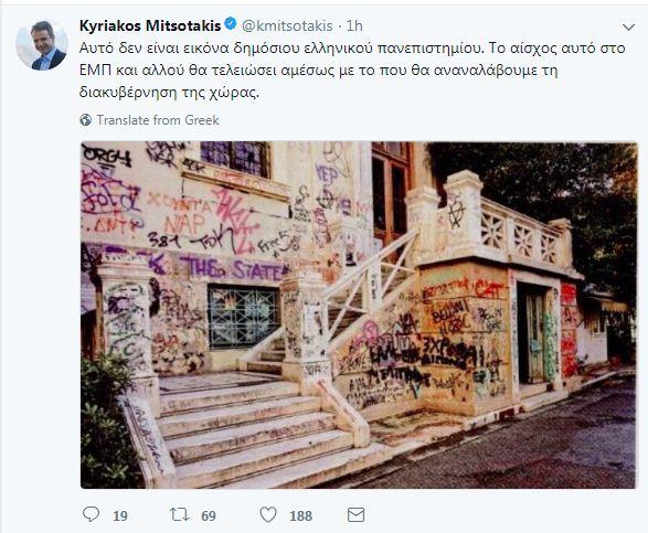 Ο πρόεδρος της ΝΔ ανήρτησε στον λογαριασμό του στο Twitter μια φωτογραφία από το κτίριο του Εθνικού Μετσοβιου Πολυτεχνείου και έγραψε: «Αυτό δεν είναι εικόνα δημόσιου ελληνικού πανεπιστημίου. Το αίσχος αυτό στο ΕΜΠ και αλλού θα τελειώσει αμέσως με το που θα αναλάβουμε τη διακυβέρνηση της χώρας».