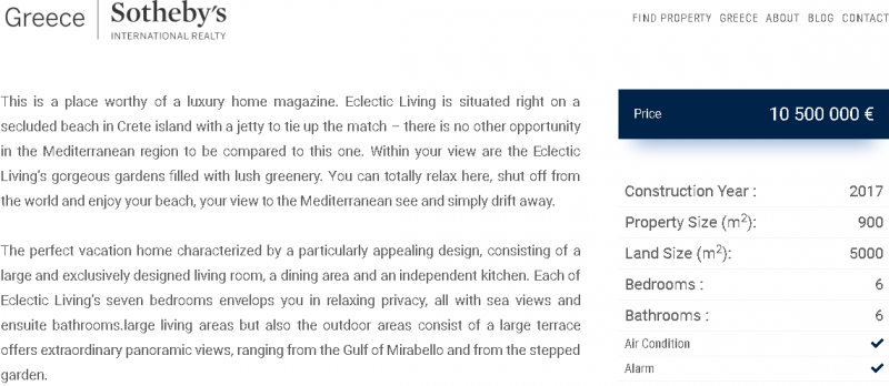 «Δεν υπάρχει άλλη τέτοια ευκαιρία στη Μεσόγειο να συγκριθεί με αυτή», αναφέρει η καταχώρηση στην ιστοσελίδα πωλήσεων πολυτελών σπιτιών sothebysrealty.gr, για το ακινητο που βρίσκεται στην Ελούντα και πωλείται αντί 10.5 εκ. ευρώ.