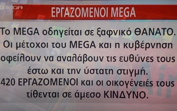Οι μέτοχοι του MEGA και η κυβέρνηση οφείλουν να αναλάβουν τις ευθύνες τους έστω και την ύστατη στιγμή. 420 εργαζόμενοι και οι οικογένειες τους τίθενται σε άμεσο κίνδυνο.”