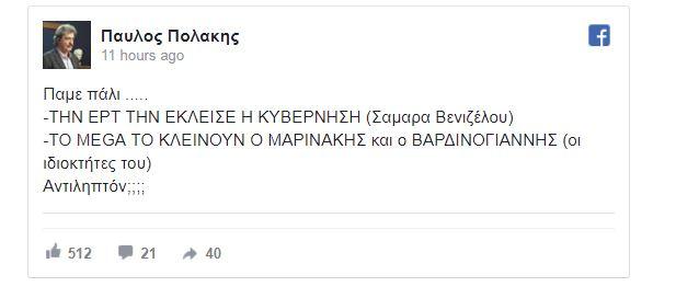 Ποικίλα σχόλια έχουν προκαλέσει οι αναρτήσεις του αναπληρωτή υπουργού Υγείας Παύλου Πολάκη στο facebook, με αφορμή τις εξελίξεις στο Mega και τα επαπειλούμενο λουκέτο.