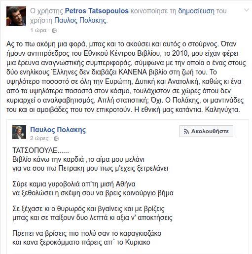 «Ας το πω ακόμη μια φορά, μπας και το ακούσει και αυτός ο στούρνος. Όταν ήμουν αντιπρόεδρος του Εθνικού Κέντρου Βιβλίου, το 2010, μου είχαν φέρει μια έρευνα αναγνωστικής συμπεριφοράς, σύμφωνα με την οποία ο ένας στους δύο ενηλίκους Έλληνες δεν διαβάζει ΚΑΝΕΝΑ βιβλίο στη ζωή του. Το υψηλότερο ποσοστό σε όλη την Ευρώπη, Δυτική και Ανατολική, καθώς κι ένα από τα υψηλότερα ποσοστά στον κόσμο, τουλάχιστον σε χώρες όπου δεν κυριαρχεί ο αναλφαβητισμός. Απλή στατιστική; Όχι. Ο Πολάκης, οι μαντινάδες του και οι αμοιβάδες που τον επικροτούν. Η εθνική μας κατάντια. Καληνύχτα».