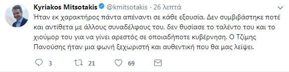 Με ανάρτησή του στο twitter ο Κυριάκος Μητσοτάκης «αποχαιρέτησε» τον Τζίμη Πανούση. «Ήταν εκ χαρακτήρος πάντα απέναντι σε κάθε εξουσία. Δεν συμβιβάστηκε ποτέ και αντίθετα με άλλους συναδέλφους του, δεν θυσίασε το ταλέντο του και το χιούμορ του για να γίνει αρεστός σε οποιαδήποτε κυβέρνηση. Ο Τζίμης Πανούσης ήταν μια φωνή ξεχωριστή και αυθεντική που θα λείψει» έγραψε ο Πρόεδρος της Νέας Δημοκρατίας.