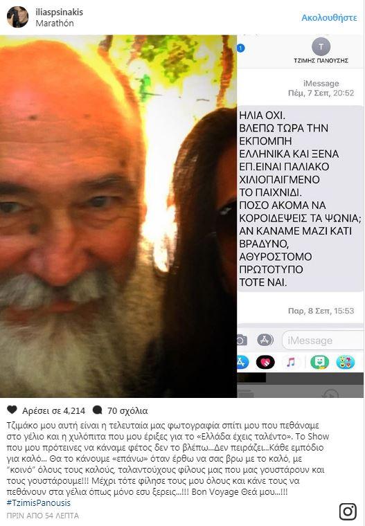 Το show που μου πρότεινες να κάναμε φέτος δεν το βλέπω… Δεν πειράζει… Κάθε εμπόδιο για καλό… Θα το κάνουμε «επάνω» όταν έρθω να σας βρω με το καλό, με “κοινό” όλους τους καλούς ταλαντούχους φίλους μας που μας γουστάρουν και τους γουστάρουμε!!! Μέχρι τότε φίλησε τους μου όλους και καντους να πεθάνουν στα γέλια όπως μόνο εσύ ξέρεις…!!! Bon voyage Θεά μου…!!!», έγραψε ο Ηλίας Ψινάκης.
