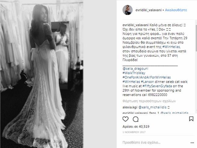 «Καλό μήνα σε όλους! Όχι δεν είπα το «Yes, I Do». Νύφη για πρώτη φορά… για έναν πολύ όμορφο και καλό σκοπό! Την Τετάρτη 29 Νοεμβρίου θα συμμετάσχω κι εγώ στο φιλανθρωπικό event της #WinHellas, στον σπουδαίο αγώνα που γίνεται κατά της βίας των γυναικών, στο 57 στη Γλυφάδα!», έγραψε στη λεζάντα της φωτογραφίας η Ευρυδίκη Βαλαβάνη.
