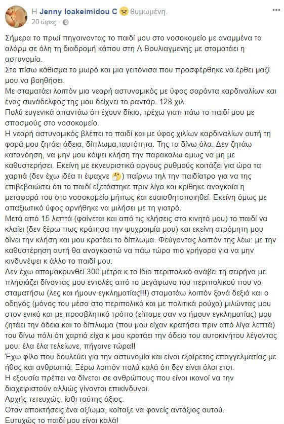 «Σήμερα το πρωί πηγαινοντας το παιδί μου στο νοσοκομείο με αναμμένα τα αλάρμ σε όλη τη διαδρομή κάπου στη Λ.Βουλιαγμενης με σταματάει η αστυνομία. Στο πίσω κάθισμα το μωρό και μια γειτόνισα που προσφέρθηκε να έρθει μαζί μου να βοηθήσει.