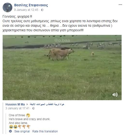 Σχολιάζοντας, ο Βασίλης Στεφανάκος έγραψε: «Γενναίος, ψυχάρα!! Ούτε τρελλός ούτε μεθυσμένος, απλώς ειναι χορτάτα τα λιοντάρια, επίσης δεν ειναι σε οίστρο και σαφως τα… θηρια… δεν εχουν εκεινα τα (ανθρωπινα ) χαρακτηριστικά που σκοτώνουν απλά γιατι μπορούν!!!».